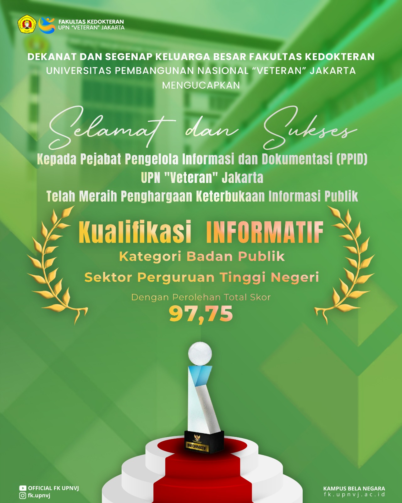 FK UPNVJ – Fakultas Kedokteran Universitas Pembangunan Nasional “Veteran” Jakarta (UPNVJ) menyampaikan apresiasi dan ucapan selamat atas capaian membanggakan yang diraih oleh Pejabat Pengelola Informasi dan Dokumentasi (PPID) UPN...