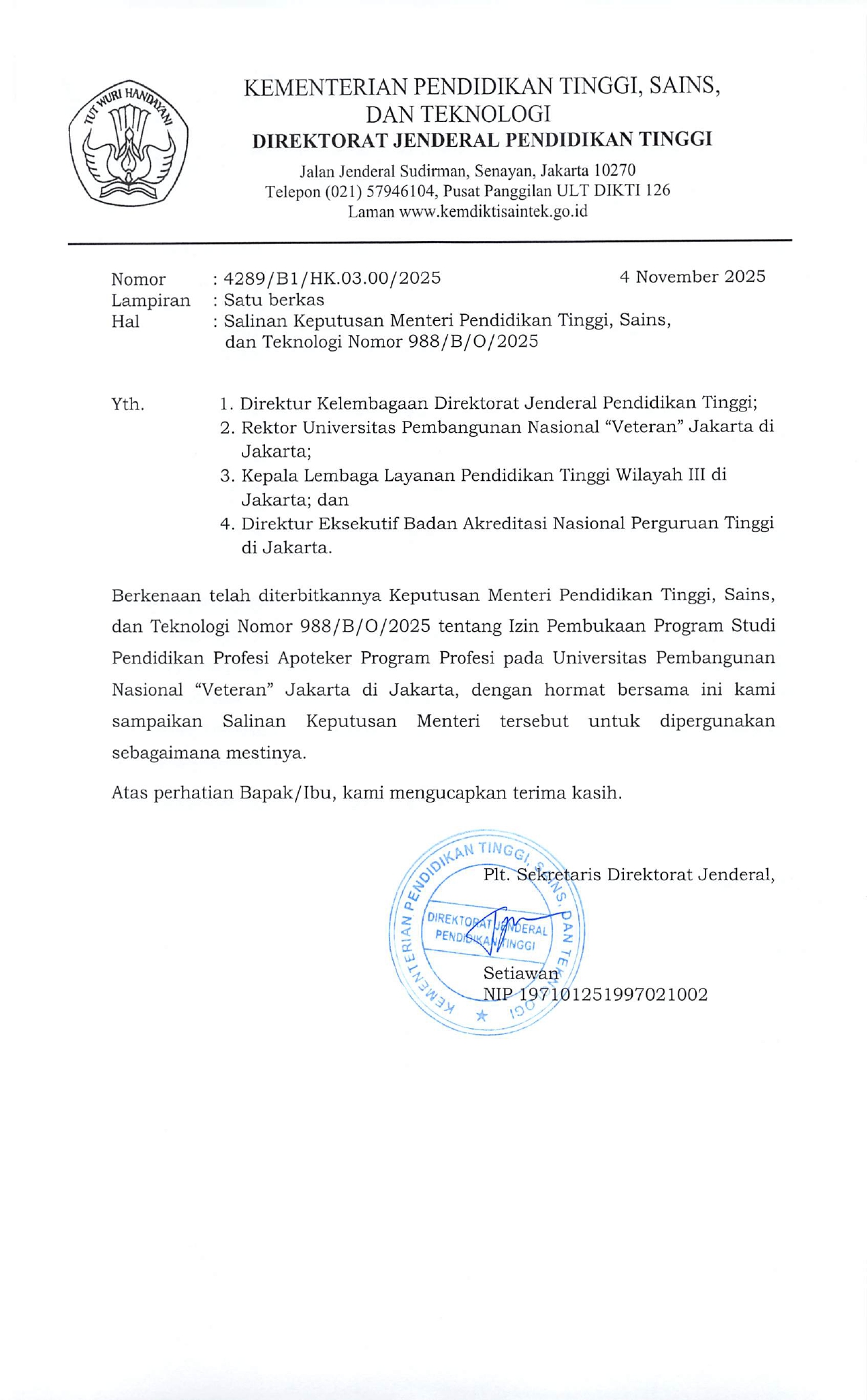 FK UPNVJ – Fakultas Kedokteran Universitas Pembangunan Nasional “Veteran” Jakarta (UPNVJ) secara resmi membuka “Program Studi Pendidikan Profesi Apoteker Program Profesi (PSPPAPP) yang ditetapkan oleh Surat Keputusan Menteri Pendidikan Tinggi, Sains dan Teknologi Republik Indonesia dengan Nomor : 988/B/O/2025 yang berisi tentang memberikan izin pembukaan Program Studi Pendidikan Profesi