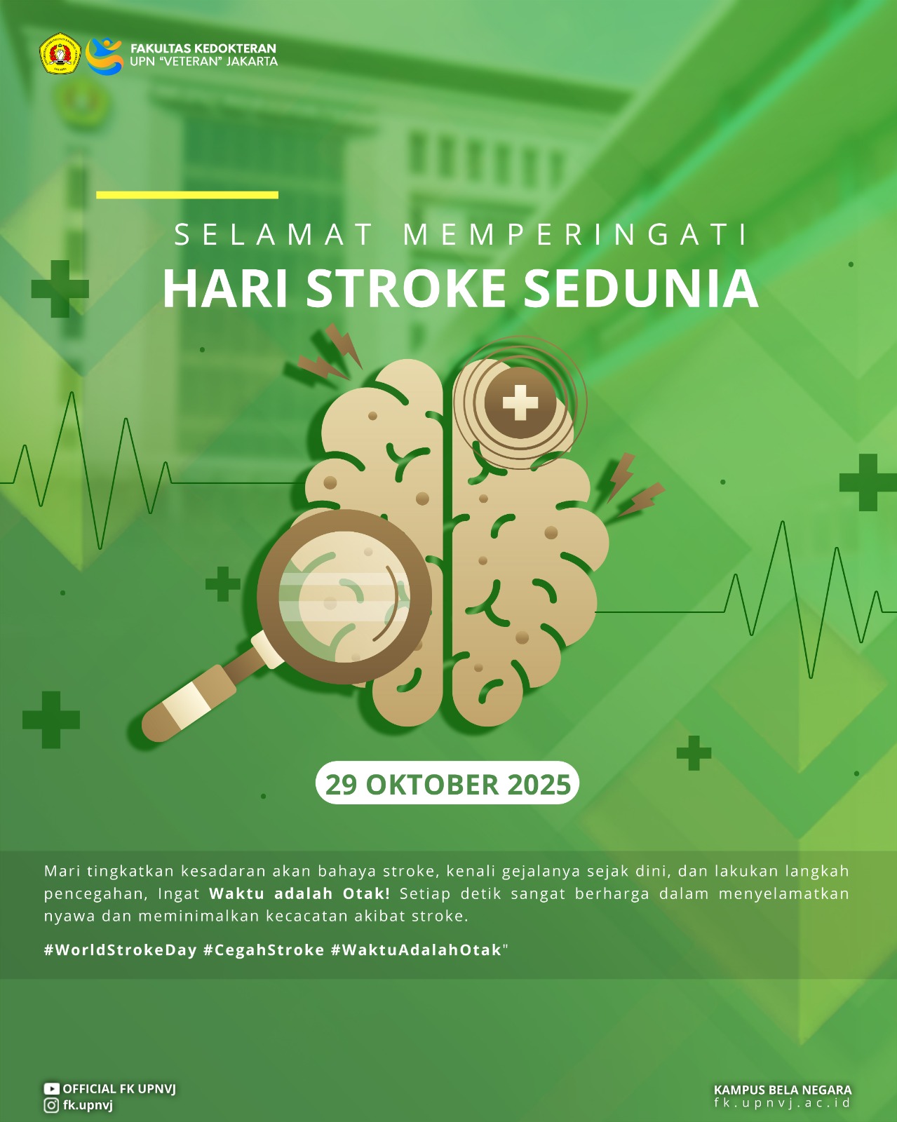 FK UPNVJ – Fakultas Kedokteran Universitas Pembangunan Nasional “Veteran” Jakarta (UPNVJ) mengucapkan “Selamat Memperingati Hari Stroke Sedunia – Mari Tingkatkan kesadaran akan bahaya stroke, kenali gejalanya sejak dini dan lakukan langkah pencegahan. Ingat Waktu adalah Otak! Setiap detik sangat berharga dalam menyelamatkan nyawa dan minimalkan kecacatan akibat stroke.
