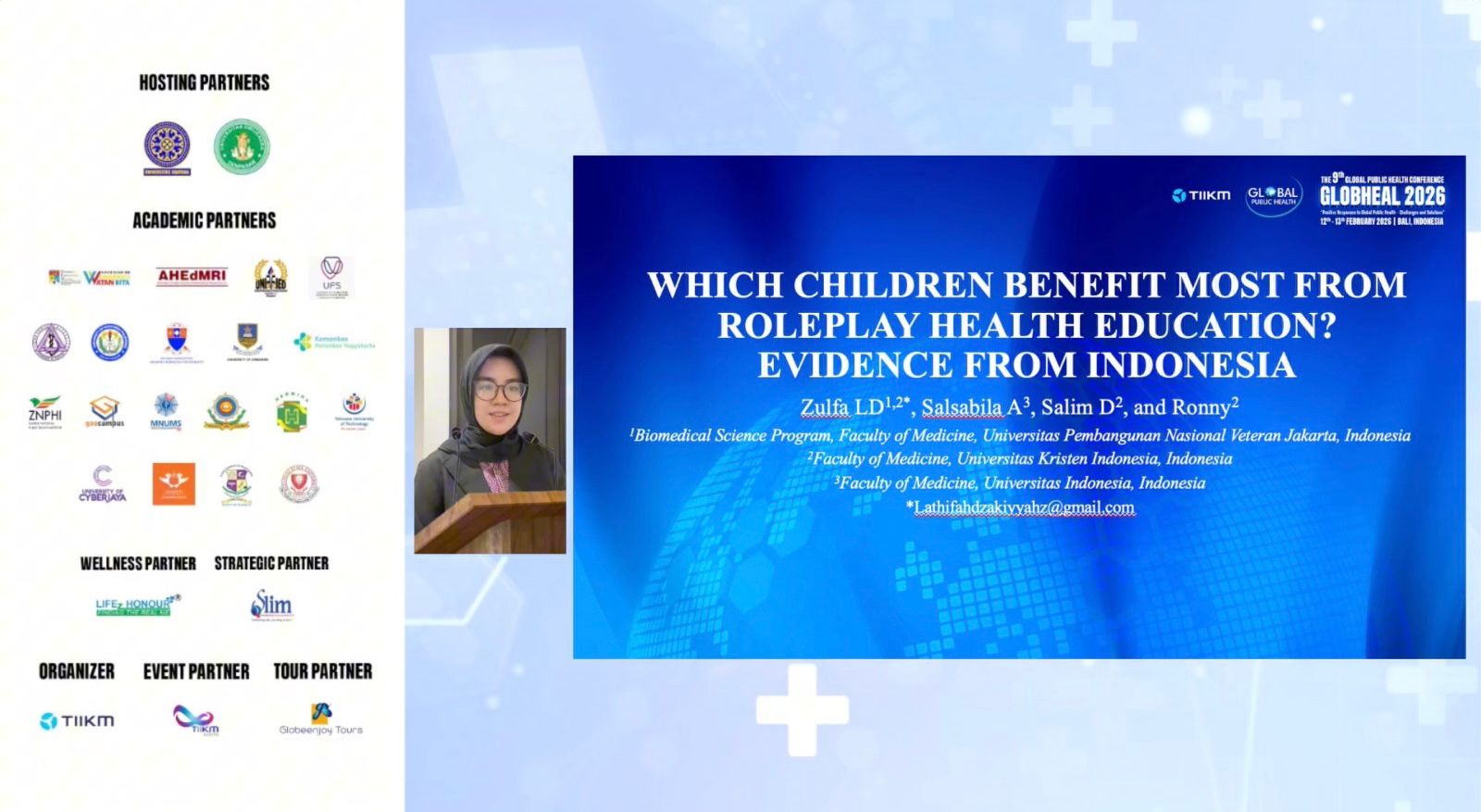 FK UPNVJ – Mahasiswa Program Studi Magister Biomedis Fakultas Kedokteran Universitas Pembangunan Nasional Veteran Jakarta (UPNVJ) Lathifah Dzakiyyah Zulfa, berpartisipasi dalam Globeheal 2026 (9th Global Public Health Conference) yang diselenggarakan pada 12 s.d 13 Februari 2026 di Bali Sunset Road Convention Center. Konferensi internasional ini diinisiasi oleh The International Institute of Knowledge Management dan mempertemukan akademisi, peneliti, praktisi kesehatan, serta pembuat kebijakan dari berbagai negara.