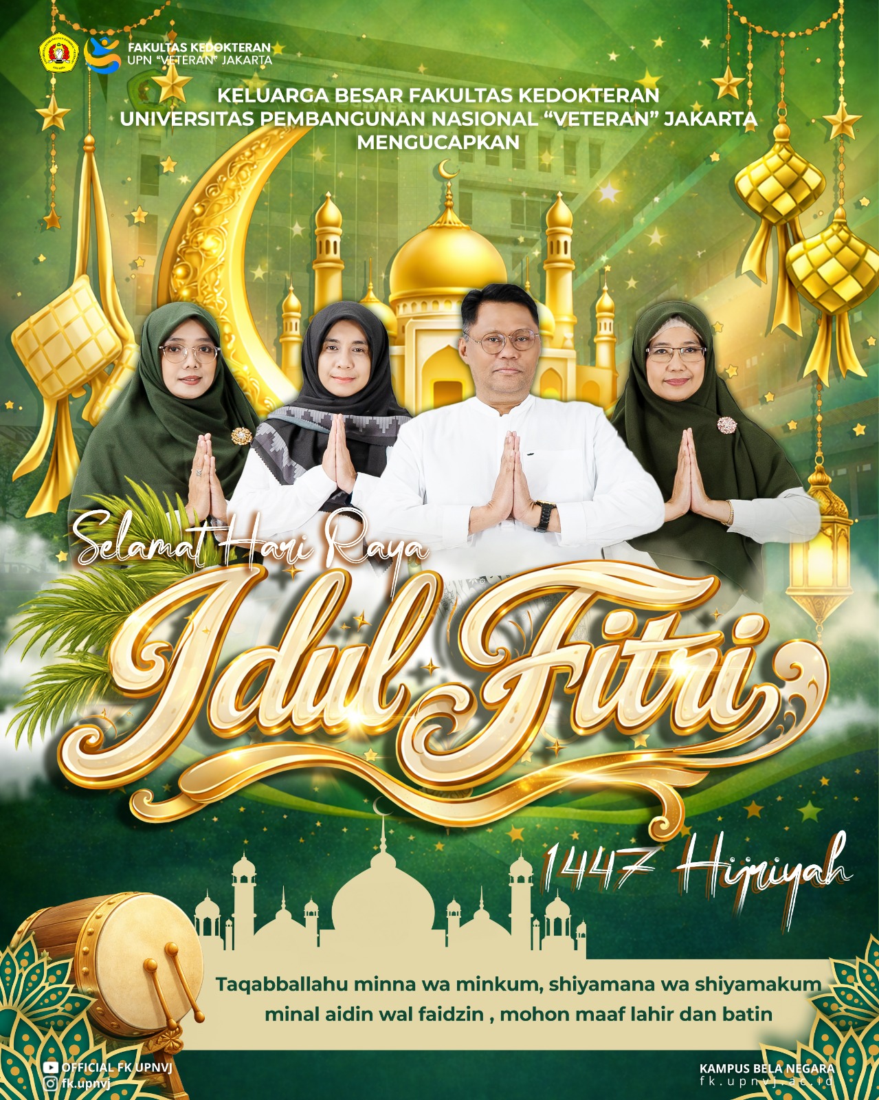 FK UPNVJ – Keluarga Besar Fakultas Kedokteran Universitas Pembangunan Nasional “Veteran” Jakarta (UPNVJ) menyampaikan ucapan Selamat Hari Raya Idulfitri 1447 Hijriah kepada seluruh sivitas akademika dan masyarakat luas pada Sabtu, 21 Maret 2026. Momentum hari kemenangan setelah bulan Ramadan dimaknai sebagai ajang refleksi untuk memperkuat nilai kebersamaan, kepedulian sosial, serta integritas dalam menjalankan peran akademik dan pengabdian kepada masyarakat.