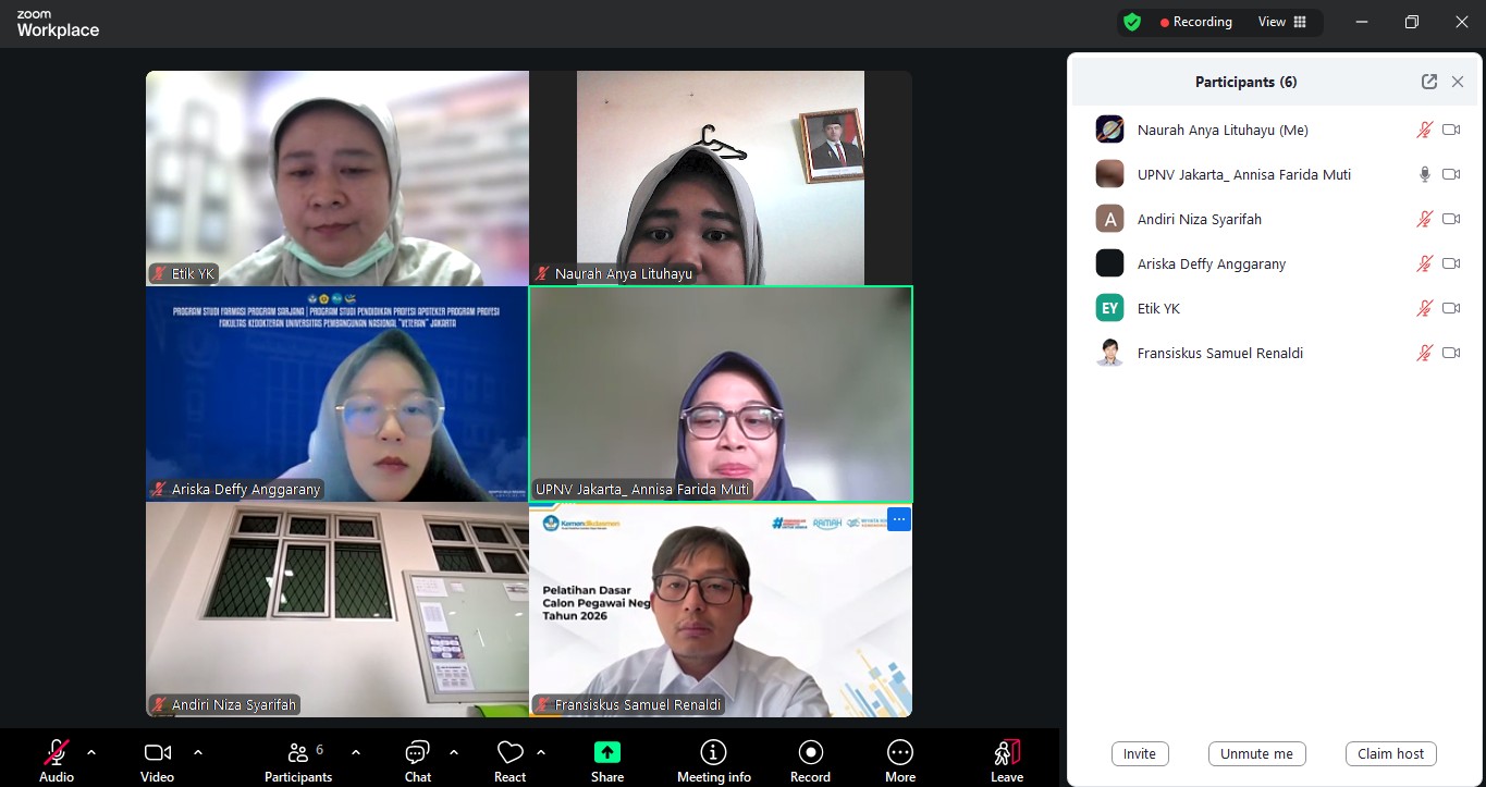 Kegiatan dilaksanakan secara offline pada tanggal 6 Maret 2026 di RSPAD dengan preseptor Ibu apt. Dra. Renni Septini,MARS. serta daring melalui Zoom Meeting pada Hari Kamis, tanggal 12 Maret 2026 dan dihadiri oleh Preseptor dari berbagai institusi yang meliputi Ibu apt. EtikYuliana (Puskesmas Cinere), Bapak apt. Luth (Kimia Farma Apotek Juanda dan Ibu apt. Ramadeni (Kimia Farma Apotek Sukahati).